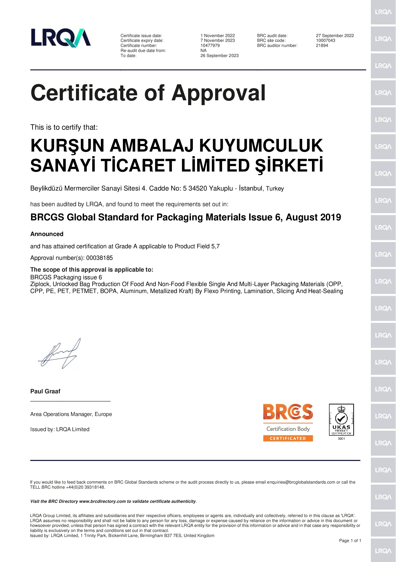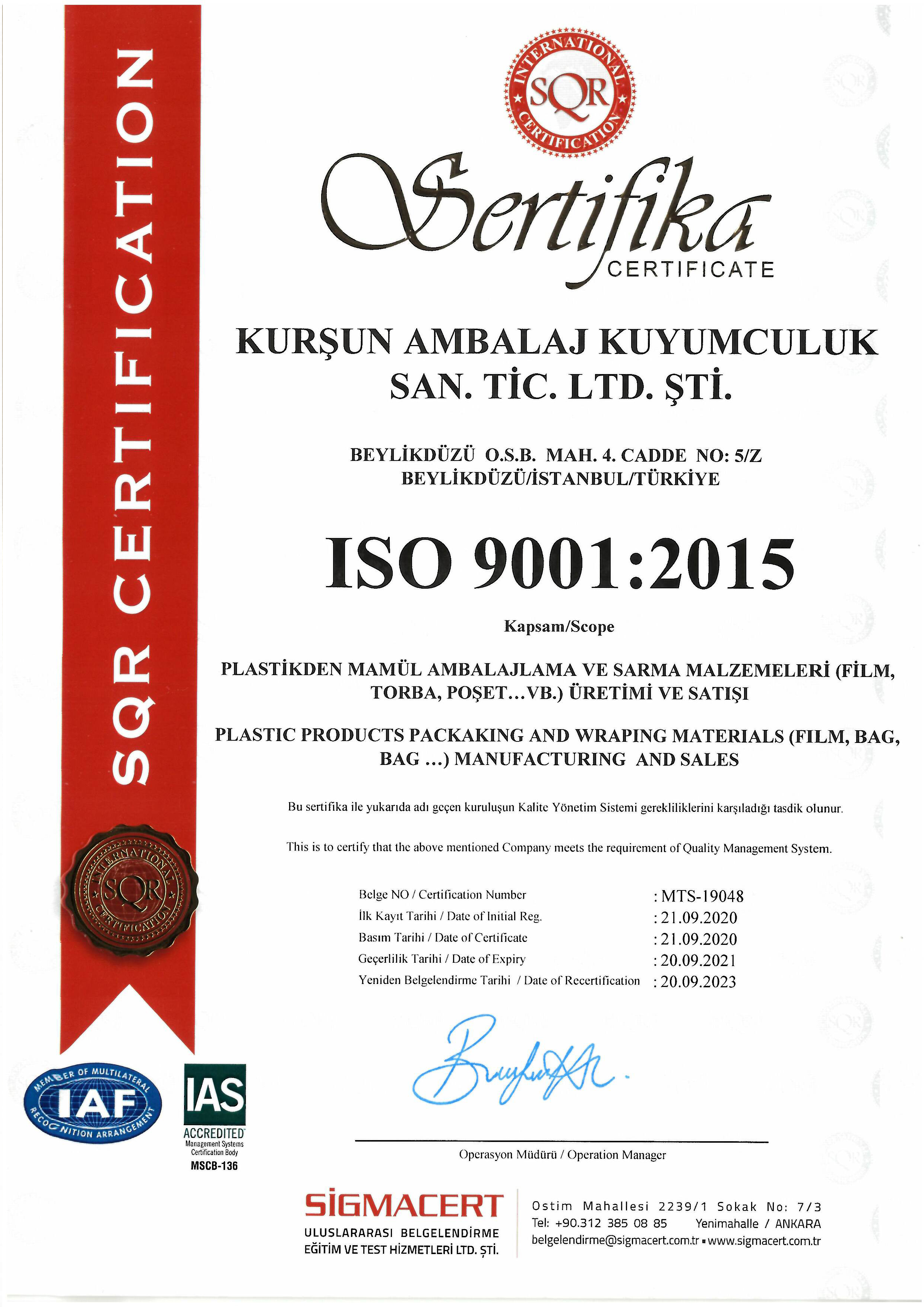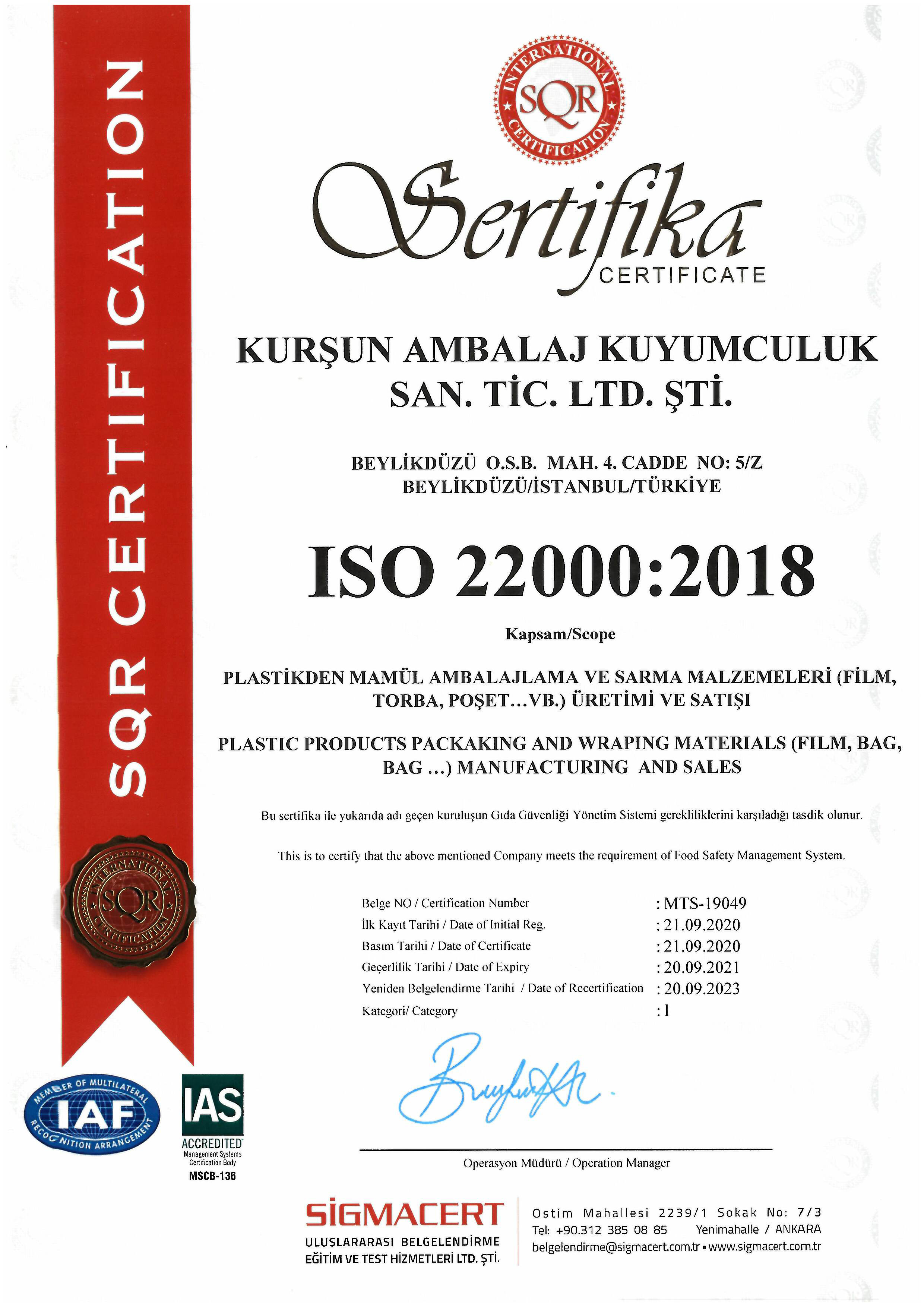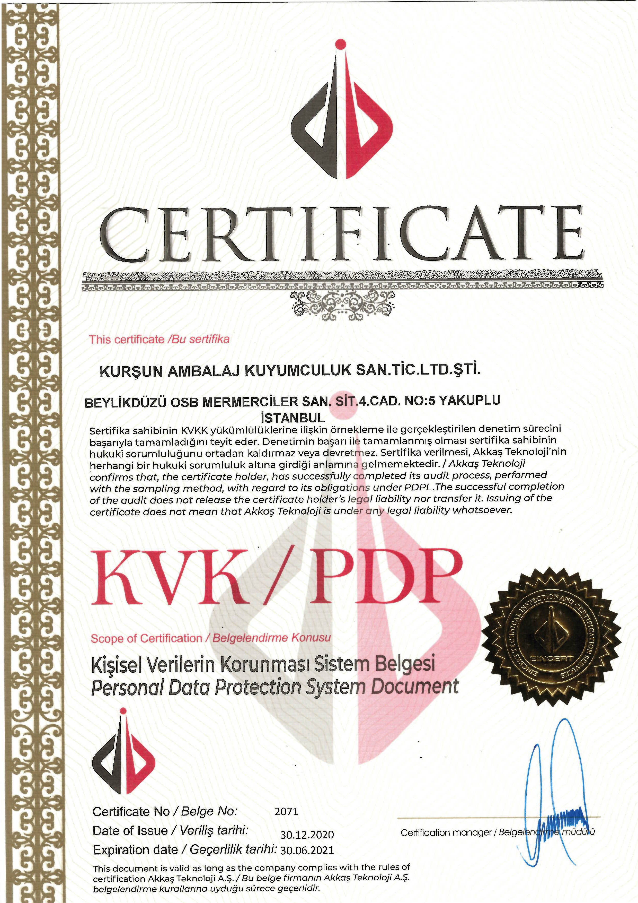 In Kurşun Ambalaj, which adopts the principle of continuous improvement in all processes and operations, the culture of quality is a way of life. Within the scope of ISO 9001, ISO 22000 certificates, Kurşun Ambalaj undergoes regular announced and unannounced audits.